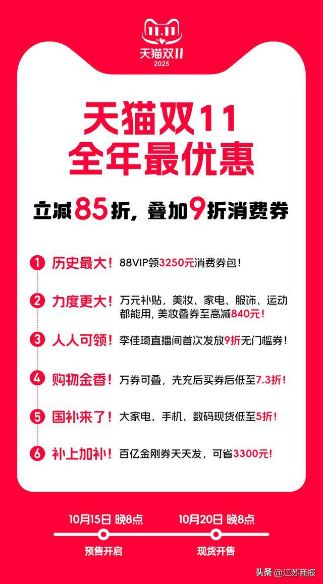 今晚8点,天猫双11预售开启,10月20日晚8点,可付尾款,正式现货开卖。无门槛加“叠中叠”,一年最优惠时刻,真来了!